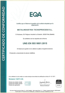 La Dirección de METALINDUSTRIA TECNOPROCESOS, S.L es consciente de los beneficios que reporta un sistema de Gestión de la Calidad para lograr mantener la calidad a todos los niveles de empresa. Además, conoce las ventajas que reporta el Sistema de Calidad basado en las Normas UNE-EN ISO 9001. Este Sistema de Calidad está concebido para asegurar que los requisitos de los clientes se cumplan con objeto de aumentar su satisfacción.